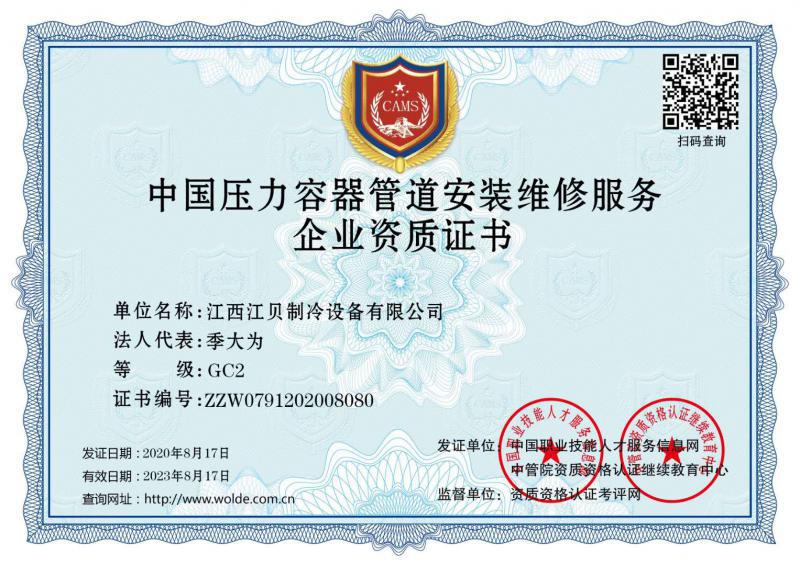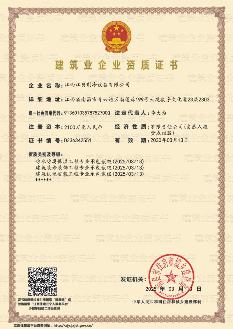 江貝冷庫安裝資質(zhì)證書