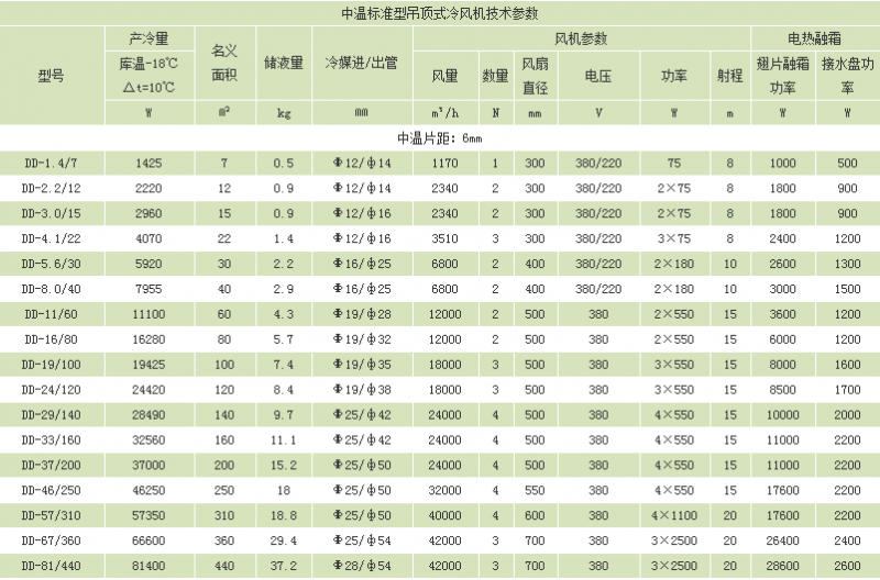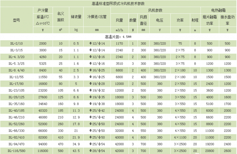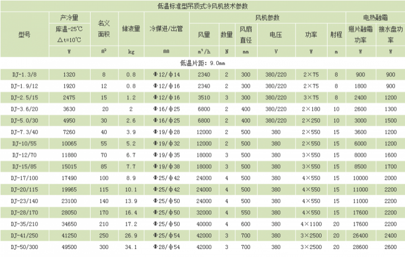 冷風(fēng)機是一種配套于氟利昂制冷機組使用的庫內(nèi)冷卻降溫設(shè)備,按適用溫度來分,分為DL、DD、DJ、三種系列,可分別適用于不同的庫溫,DL型冷風(fēng)機主要適用于0℃左右的保鮮庫;DD型冷風(fēng)機主要適用于-18℃的冷藏庫,DJ型冷風(fēng)機主要適用于-25℃以下的速凍庫  。