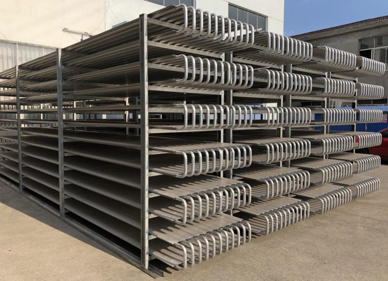 本實(shí)用新型公開(kāi)了一種速凍間擱架,包括四根呈矩形排布的立柱,左右相鄰的兩根所述立柱之間穿插有連桿,前,后相鄰的兩根所述立柱之間穿插有第一連桿,所述連桿的外壁處開(kāi)設(shè)有穿過(guò)所述第一連桿的孔,所述第一連桿的外部處焊接有擋板,所述擋板限位在所述立柱的內(nèi)側(cè),所述第一連桿穿過(guò)所述立柱的那一端螺紋連接有一螺母,在前,后設(shè)置的兩根所述立柱之間裝配有排架,所述排架上,下等距設(shè)置有多個(gè),在所述排架的側(cè)面橫向貫穿設(shè)置有多個(gè)安裝孔,還包括U字形的銅制的導(dǎo)冷管,所述導(dǎo)冷管的兩端穿過(guò)兩側(cè)的排架;本產(chǎn)品可以利用冷媒直接與被速凍的食品接觸,增加冷凍效率.